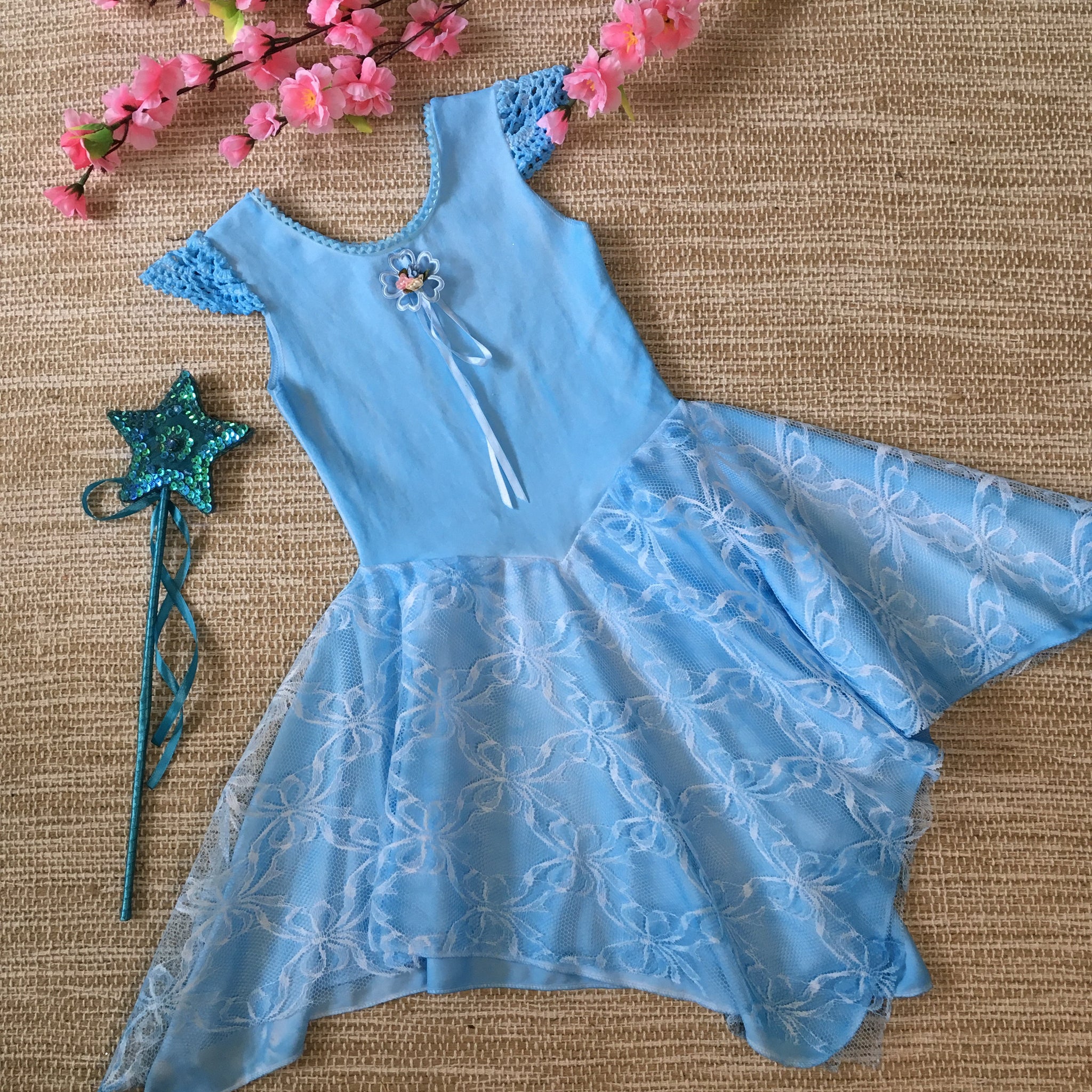 The bodice is a cotton spandex fabric, which has some stretch allowing for growth. It has a little capped crochet sleeve. The skirt is polyester lace with a polyester lining. The cut is a full circle, so twirls beautifully!